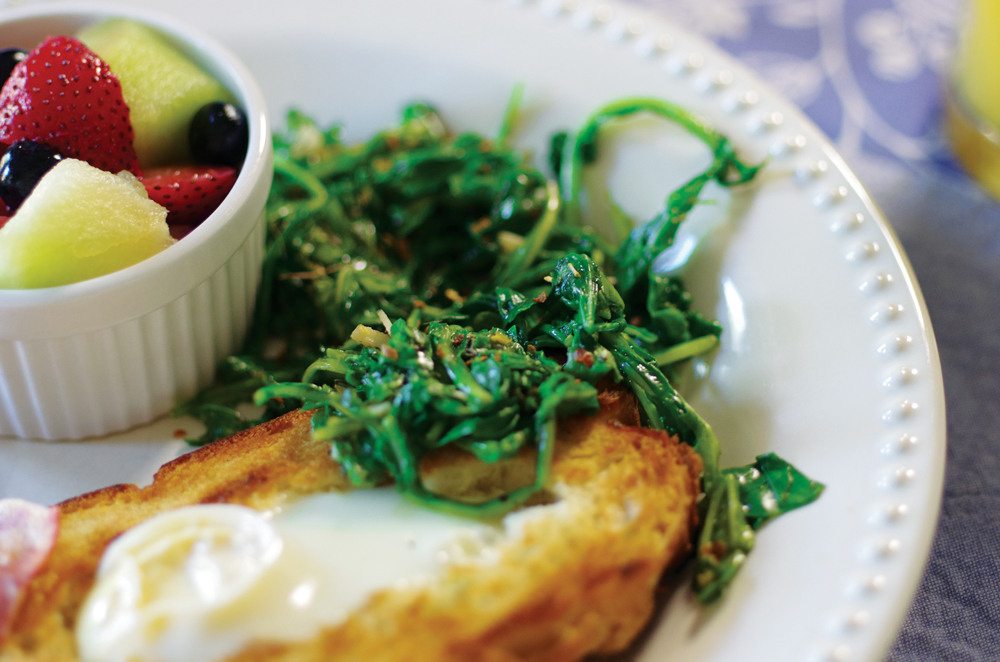 Sprinkle with goat cheese or serve as is with eggs of your choice – we like “egg in a nest.”