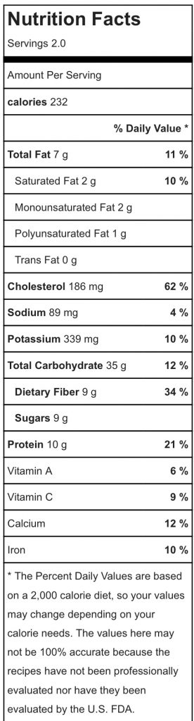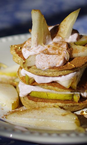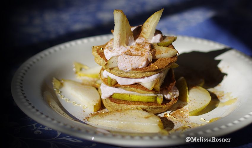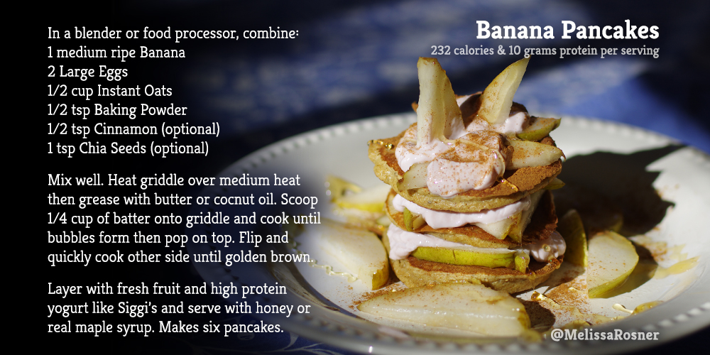 Remove from heat and serve layered with seasonal fruit and a high-protein yogurt, like Siggi’s. Serve warm with honey or maple syrup. *Please note: nutritional info is for pancakes only – it does not include fruit or toppings!