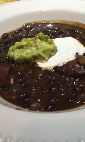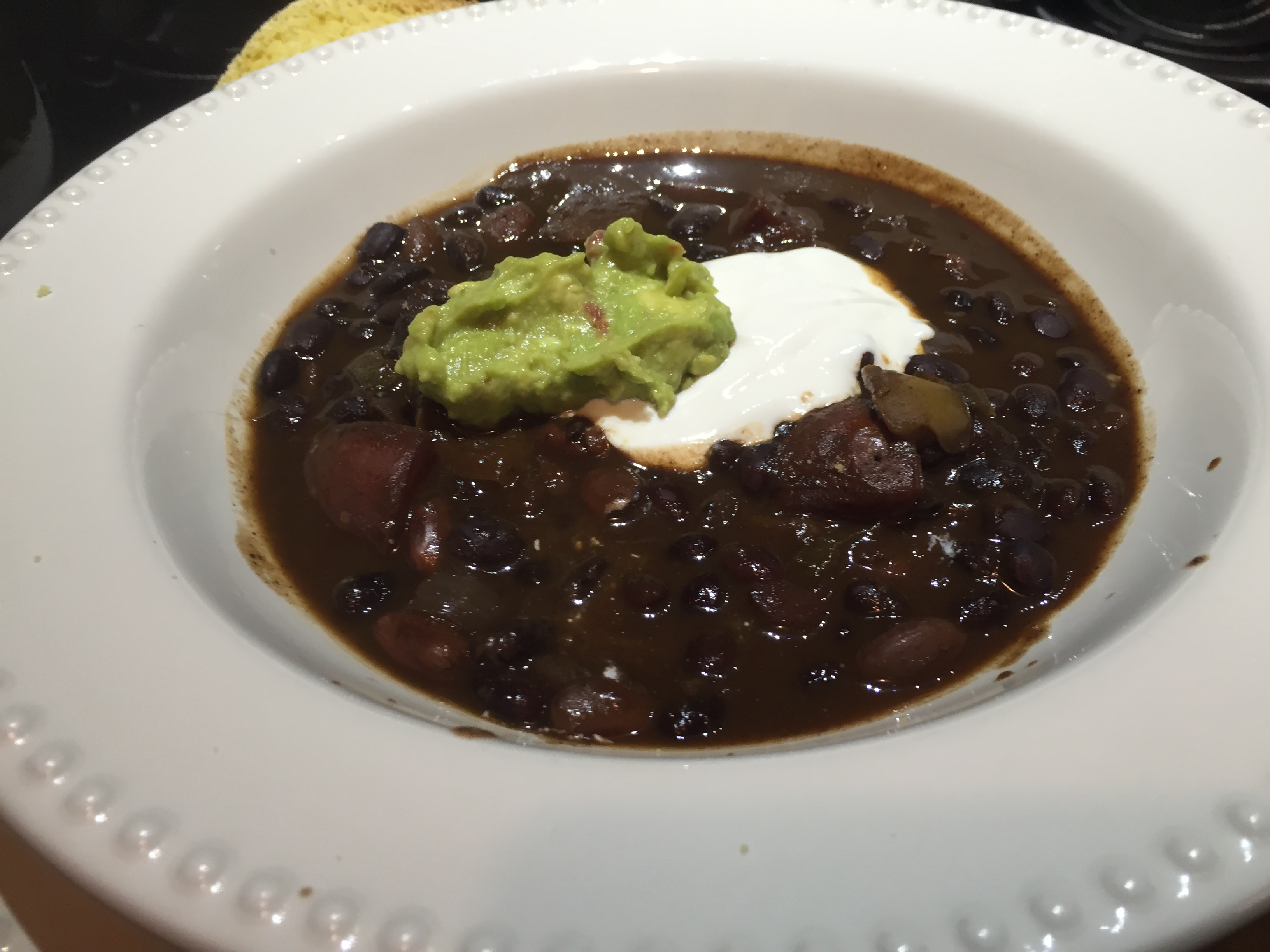 Top with avocado, cherry tomatoes, chopped scallions, cilantro, shredded cheese, and sour cream. Serve with rice, quinoa, and/or corn bread.