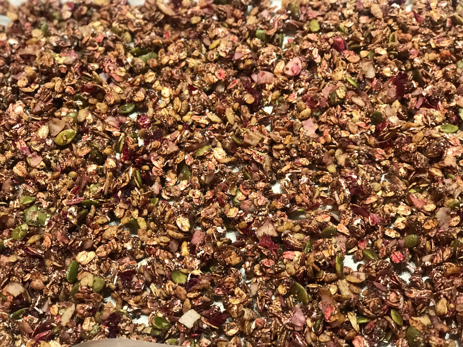 Make a well in the center of the dry ingredients and pour in the liquid mixture. Mix well. The mixture should be fairly dry and take some time to combine completely.