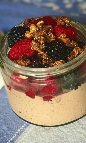 Add all ingredients to a bowl, jar, or some small glass container. Mix well. Cover and refrigerate overnight. Serve with fresh berries.
