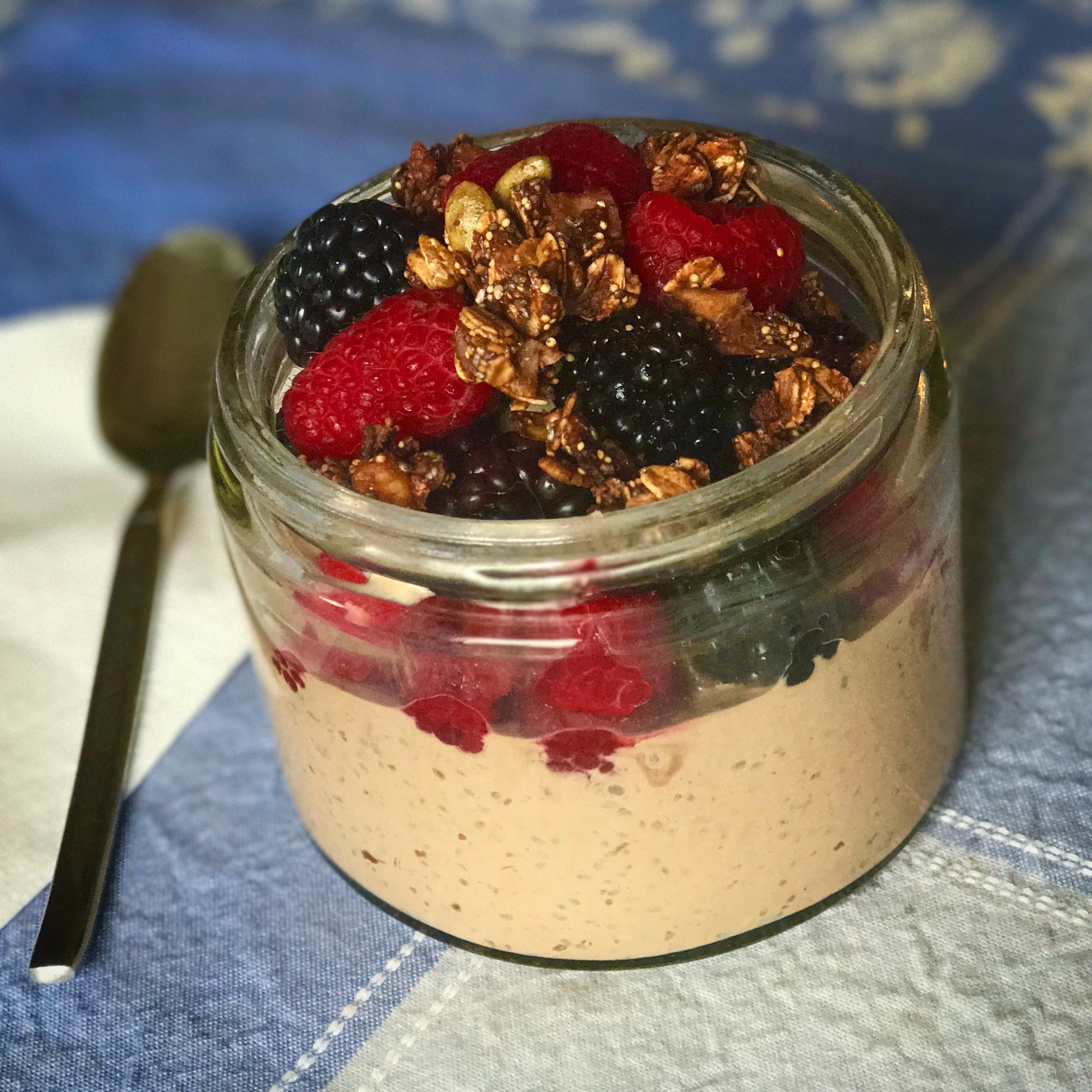 Add all ingredients to a bowl, jar, or some small glass container. Mix well. Cover and refrigerate overnight. Serve with fresh berries.