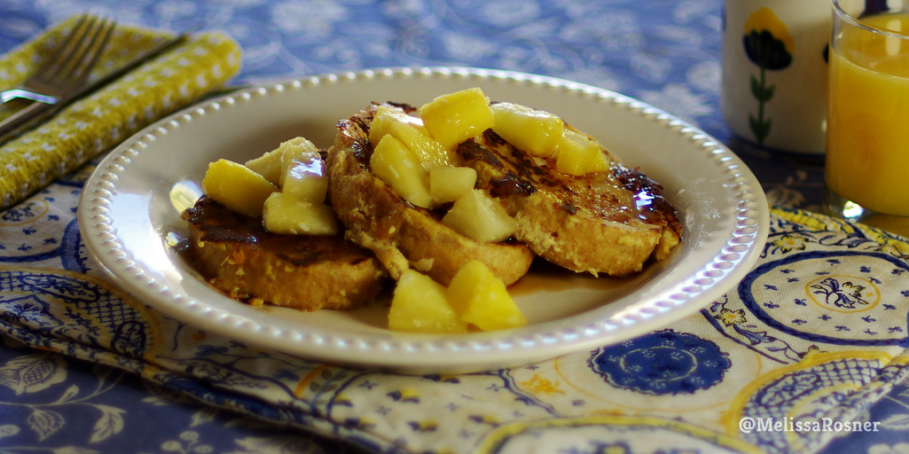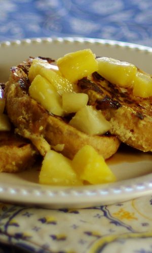 Lightly coat griddle with coconut oil spray, heat up over medium heat then add bread slices. Sprinkle each slice with remaining crushed coconut flakes. Cook for 10 minutes or until golden brown. Flip and cook other side until golden brown. Remove from heat. Place on plate and add warm pineapples to top. Serve immediately with a drizzle of honey or maple syrup.