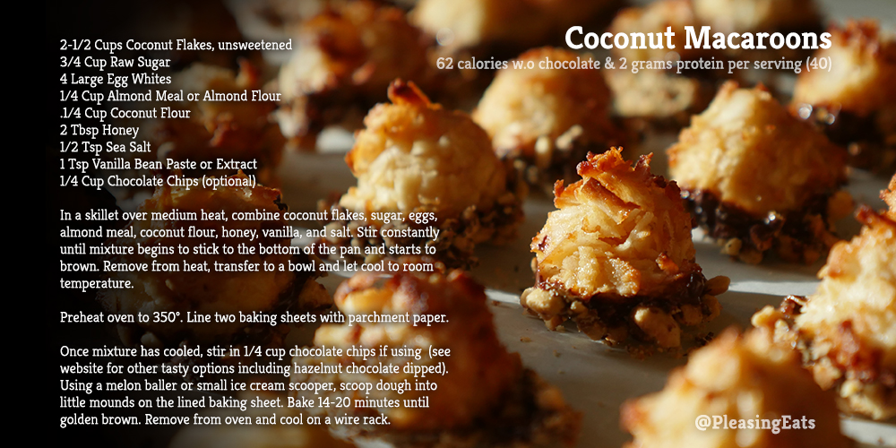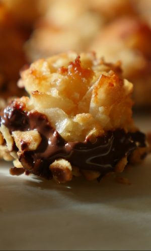 OPTION TWO: if you didn’t stir in chocolate chips before baking, melt 1/3 cup chocolate chips in a small bowl in the microwave by cooking chips for 30 seconds, stirring, then cooking for another 30 seconds and repeating until the chips are completely melted. Stir in 1 tsp canola or vegetable oil. Dip the bottom of each macaroon in the melted chocolate.