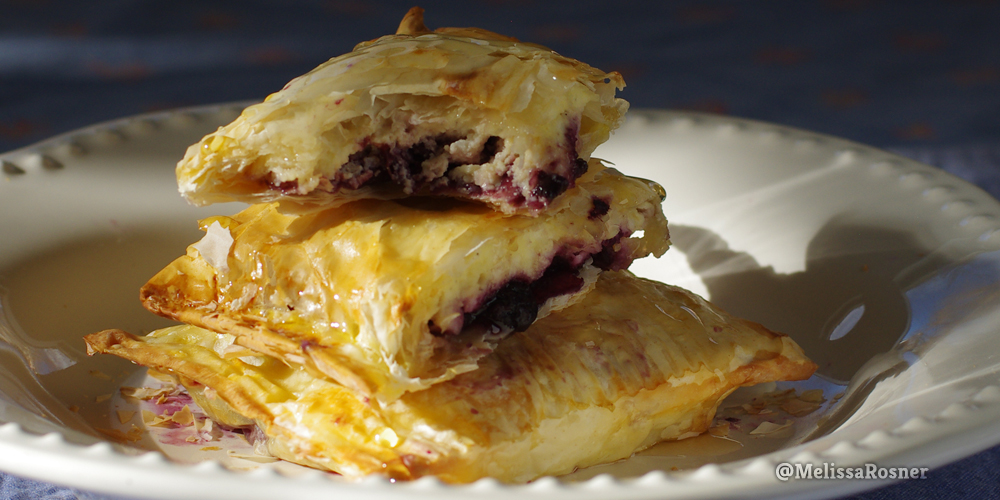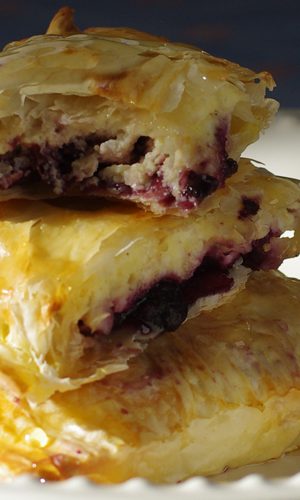 On a flat surface, paint edge of two stacked filo sheets with the egg wash. Fold in half long ways. Add 1 tbsp cheese mixture approximately 1” from the edge then top with 1 tbsp fruit mixture. Paint edges of top, exposed sheet and fold over, end over end until a pocket is formed. Press together edges to make sure they’re sealed. Brush both sides of pocket with egg wash and place on parchment-lined baking sheet.