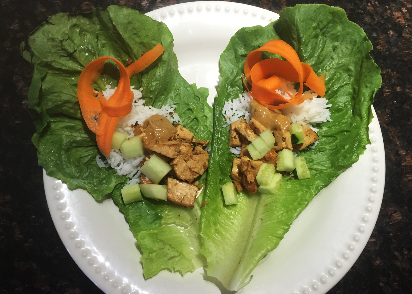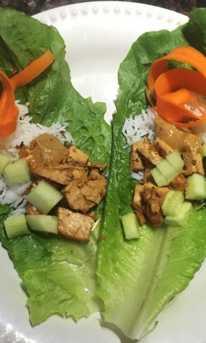 On a plate, arrange two large lettuce leaves. Top with tofu mixture, peanut sauce, cucumbers, and carrots then wrap into a roll. Serve with rice or udon noodles, topped with remaining peanut sauce.