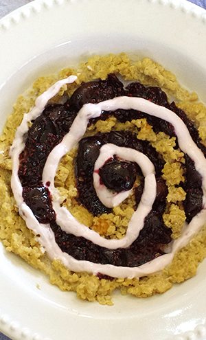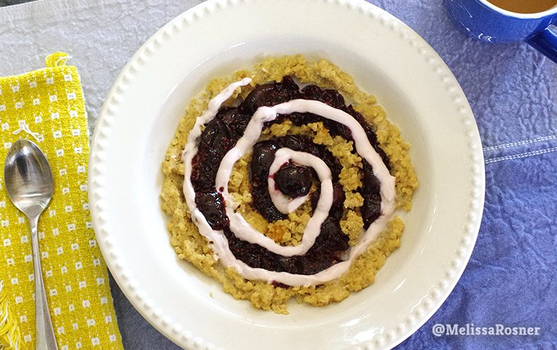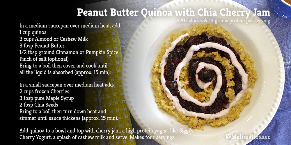 Add quinoa to a bowl and top with cherry jam, a high protein yogurt like Siggi’s Cherry Yogurt, a splash of milk and serve.