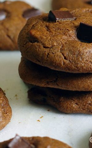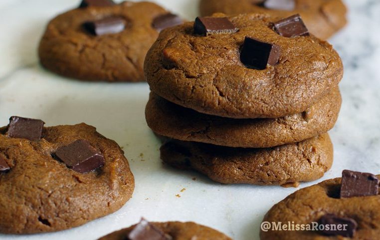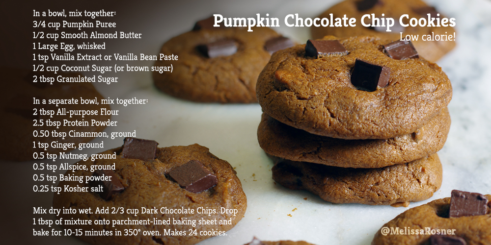 Mix in chocolate chips then drop a tablespoon-sized dollop onto a baking sheet lined with parchment paper (fewer calories and quicker clean up).
