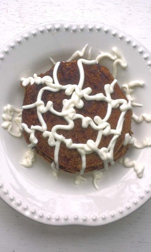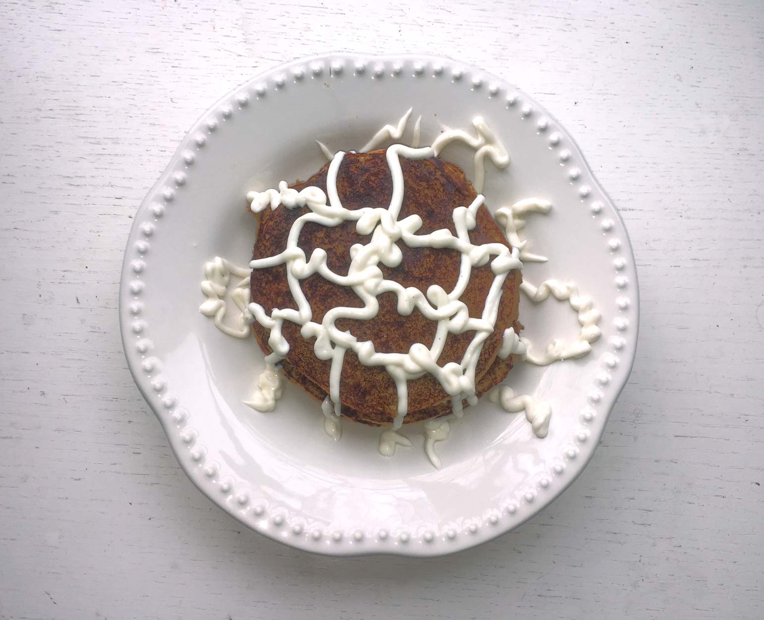 Stack four pancakes on a plate, squeeze cream cheese topping on top of stack. Serve with syrup and/or remaining yogurt if desired.