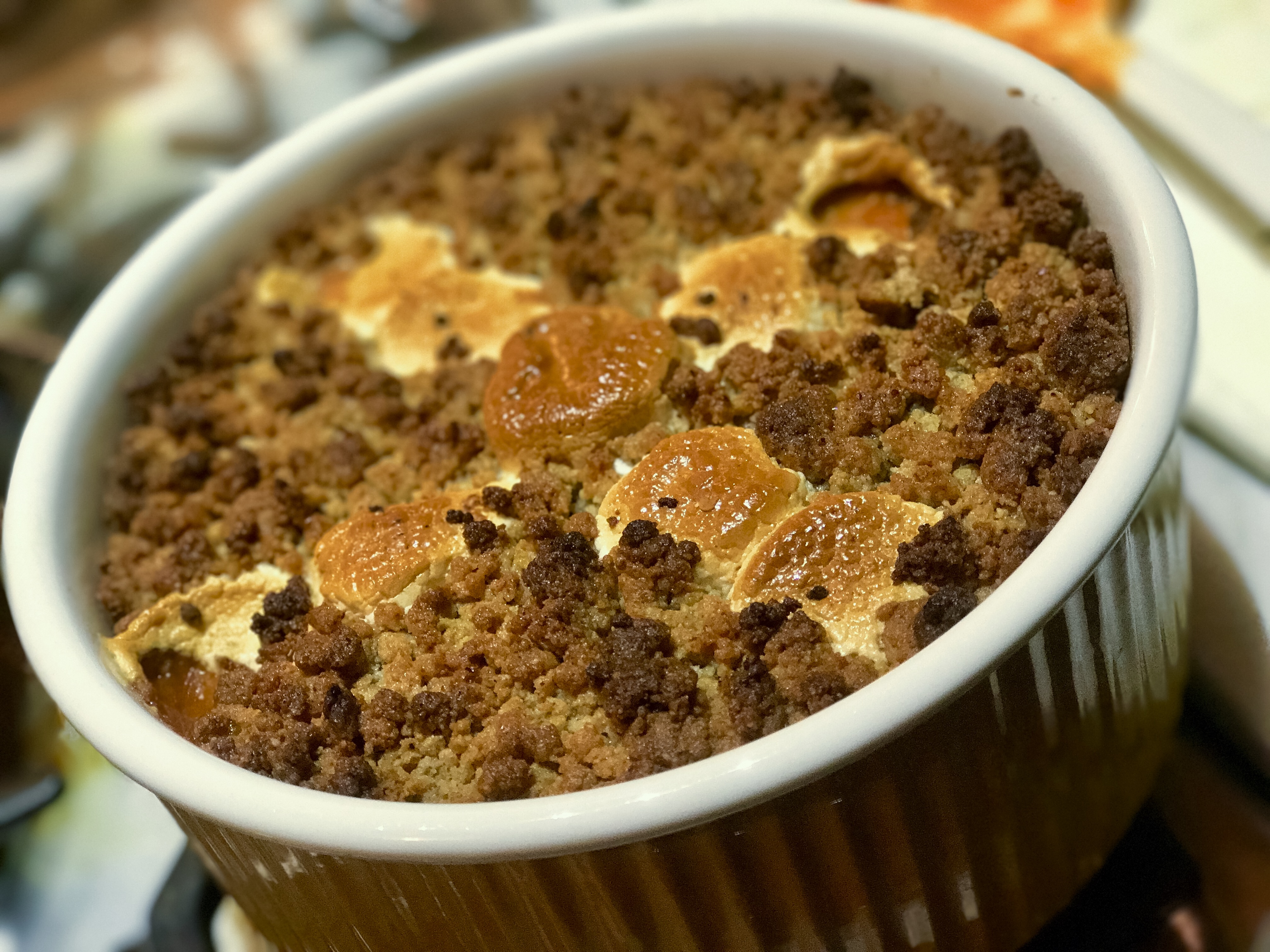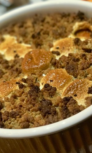 Unwrap sweet potatoes and add to a large bowl and mash with a fork. You can also use a stand mixer to whisk until mashed. Add milk, eggs, butter, vanilla, sugar, salt (and yogurt if using) and whisk until well combined and smooth. If not using a stand mixer you can use a immersion blender until mixture is creamy smooth. Add mixture to 12″ ramekin or other deep dish. Add rows of marshmallow (or flaked coconut) alternating with pecan topping.