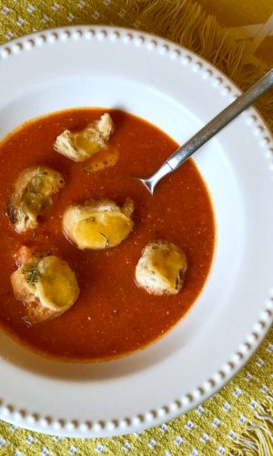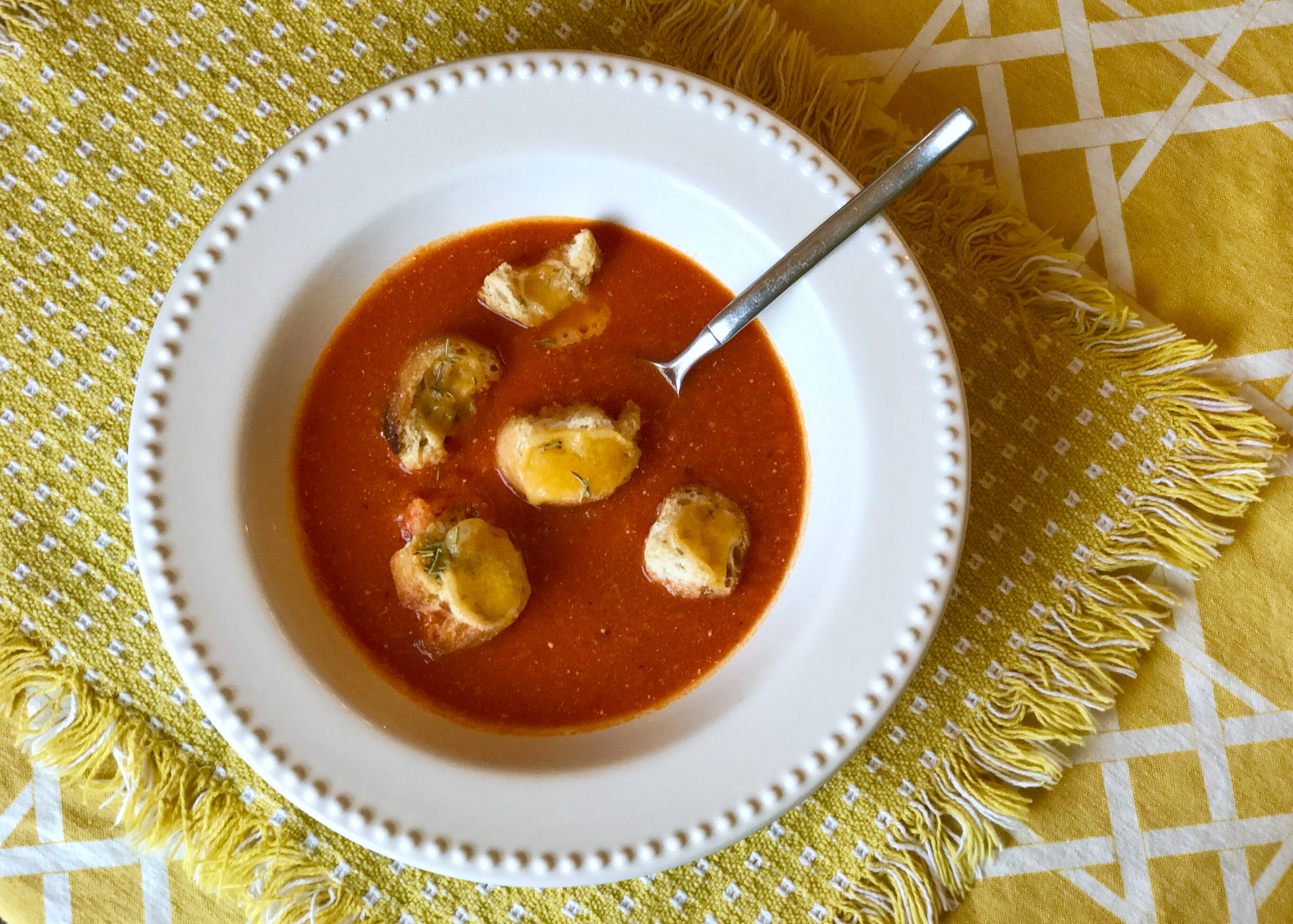 Scoop into bowls. Top with goat cheese, fresh basil leaves, or cheese croutons.